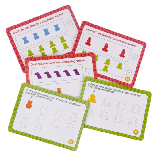 Zestaw zawiera elementy do sortowania według różnych kategorii, co rozwija zdolności logicznego myślenia i organizacji. Karty z pytaniami pozwalają na naukę liczenia, rozwijając zdolności matematyczne.