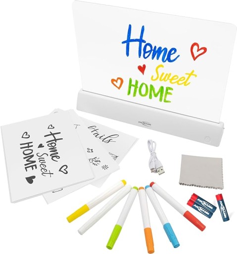 - Zawartość: tablica kreślarska, podstawa LED, 3 baterie mignon AA, kabel micro USB, 20 szablonów rysunkowych, 1 ściereczka do czyszczenia, 6 pisaków kredowych