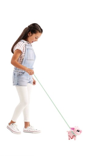 Mała, słodka świnka, która uwielbia chodzić i tańczyć. Zabierz ją na spacer na załączonej w zestawie specjalnej smyczy. Ma miękką w dotyku skórę, ponad 25 dźwięków i reakcji np. porusza noskiem, chrumka i zdarza się jej puścić bączka. Reaguje na dotyk, uwielbia przytulaski! Oprócz spacerów lubi też tańczyć do muzyczki, którą gra. A po całym dniu zabaw nakarm ją butelką, aby miała siłę na nową porcję zabawy.