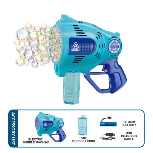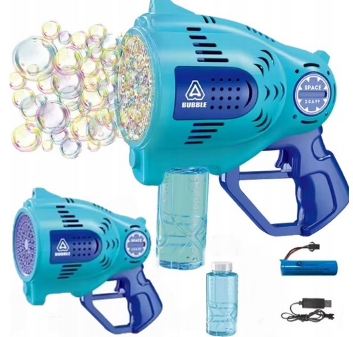 Niesamowity pistolet do produkcji baniek mydlanych, który po naciśnięciu na spust puszcza mnóstwo mieniących się bąbelków.