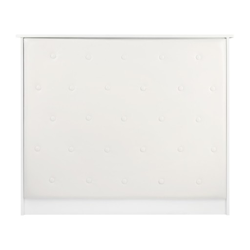 Mebel ten wykonano z wysokiej jakości, trwałej płyty laminowanej w odcieniach bieli, a gładkie powierzchnie nie sprawiają problemów w utrzymaniu czystości – w razie zabrudzenia wystarczy przetrzeć je wilgotną ściereczką. Ozdobna część frontalna została obita skórą syntetyczną w odcieniach bieli, co nadaje jej stylowego sznytu, zapewnia trwałość mebla oraz łatwość czyszczenia. Ozdobne guziki dodają elegancji i wyjątkowości, podkreślając charakter wnętrza. Recepcja została starannie wykonana, jest stabilna, a zastosowane materiały pozwalają na wieloletnie efektywne użytkowanie.