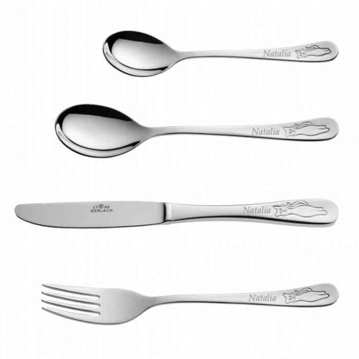 - Chromowana stal nierdzewna dodaje każdemu elementowi zestawu niezwykłej urody, a motywy zwierzątek w dolnej części każdego ze sztućców rozweselą naszych milusińskich.