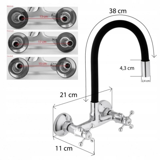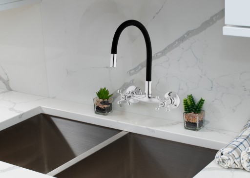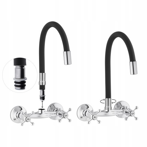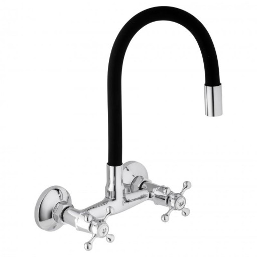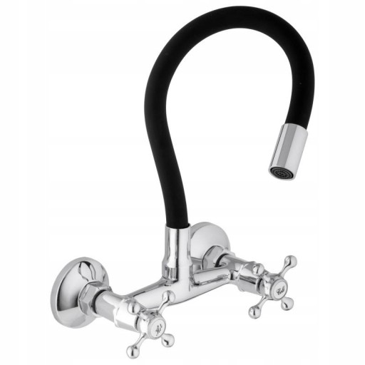 Mechaniczna bateria zlewozmywakowa, ścienna, dwuuchwytowa. Posiada długą, elastyczną wylewkę z pamięcią kształtu w kolorze czarnym, która daje możliwość nie tylko szybkiego opłukiwania naczyń czy umycia zlewu, ale również wygodnego napełnianie garnków wodą.