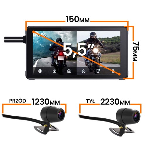 - Kamera motocyklowa z nawigacją GPS – duży, czytelny dotykowy ekran 5,5” w technologii IPS. Obsługa Google Maps, Yanosik i innych aplikacji do nawigacji GPS.