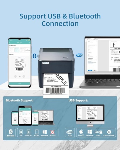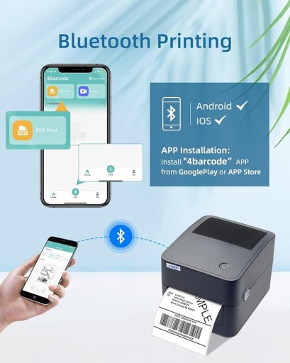 Termiczna drukarka etykiet vretti 4x6 z bluetooth Cechy: Ta drukarka etykiet wysyłkowych obsługuje etykiety o szerokości 25,4–115 mm (1–4,5 cala). Szybkie drukowanie z prędkością 6 cali (152 mm)/s. Regulowana szerokość nacisku w zakresie 1–4,25 cala. Szeroko stosowane dla Amazon, eBay, USPS, UPS itp. Brak wymagań dotyczących atramentu/taśmy TTR, oszczędzaj pieniądze. Termiczna drukarka etykiet vretti współpracuje ze wszystkimi systemami Windows i Linux Nie jest kompatybilny z Macbookiem