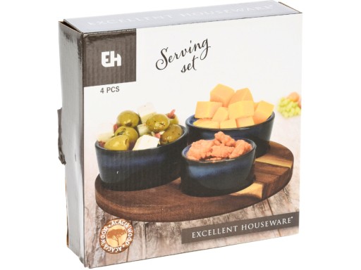 Zestaw 3 kamionkowych miseczek, na tacy z drewna akacjowego - do serwowania oliwek, orzeszków, przekąsek, sosów itp. Doskonałe również do słodkich mini deserów.