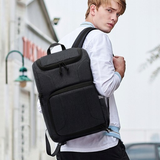 Przedstawiamy Państwu średniej wielkości plecak fotograficzny przeznaczony na aparat, akcesoria fotograficzne i laptopa. Wykonany został z wytrzymałego i wodoodpornego materiału w stonowanych kolorach szarości. W głównej komorze plecaka, w jej dolnej części znajdują się miękkie przegródki (przypinane na rzep), dzięki którym możesz oddzielić zapakowane obiektywy w dowolnej konfiguracji, natomiast w górnej części znajduje się przestrzeń na dodatkowe akcesoria. Plecak można otworzyć z trzech stron: z góry, z przodu i z boku. Na przedniej klapie od wewnętrznej strony znajduje się siatkowa kieszeń na drobne akcesoria np. karty pamięci lub kable. W tylnej części plecaka, pod szelkami znajduje się duża, miękka kieszeń na laptopa w rozmiarze do 13,3 zapinana na rzep. Statyw fotograficzny można umieścić w kieszeni z boku plecaka i przymocować specjalnymi troczkami. Tył plecaka i szelki wyłożone są grubą, oddychającą gąbką, dzięki czemu plecak jest wygodny w noszeniu. Szelki plecaka posiadają dodatkowe zapięcie na wysokości klatki piersiowej, aby lepiej rozłożyć ciężar plecaka.