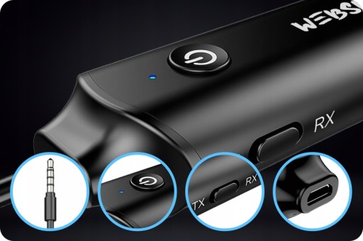 W trybie nadajnika wystarczy, że podłączysz Webski STICK do urządzenia, z którego chcesz nadawać dźwięk (audio out), a następnie na urządzeniu odbiorczym np. słuchawkach włączysz tryb parowania. Transmiter automatycznie je wykryje i się z nim połączy - bez potrzeby żadnego interfejsu!