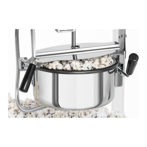 Urządzenie jest bardzo wydajne, posiada moc 1600 W, która szybko nagrzewa garnek i utrzymuje ciepło gotowego popcornu. Dzięki temu wytwarza 5-6 kg kukurydzy w ciągu godziny a jedna porcja jest gotowa w zaledwie 2 min. Garnek został pokryty teflonem co sprawia, ze idealnie nadaje się do użytku komercyjnego. Ziarna nie przywierają do naczynia co ułatwia czyszczenie i wydłuża jego żywotność. Oświetlenie komory włącza się wraz z funkcją podgrzewania, co pozwala zaprezentować zawartość maszyny. Witryna została wykonana ze szkła hartowanego. Wzornictwo utrzymane zostało w stylu retro.