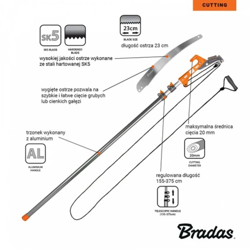 Produkt posiada teleskopowy trzonek posiadający możliwość regulacji od 155 cm do 375 cm oraz ostrze wykonane ze stali hartowanej SK5.
