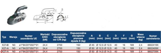 Żeliwny zaczep kulowy K27 A. Oryginał renomowanej firmy Knott. Zaczep na rurę o średnicy 50 fi. Montowany przede wszystkim do urządzeń najazdowych K27. W zestawie posiada dwie śruby montażowe z nakładkami o średnicy 14 mm. Rozstaw otworów montażowych 40 mm. Zaczep K27 posiada wskaźnik zużycia. Maksymalne DMC 2700 kg, nacisk na kulę haka 150 kg.