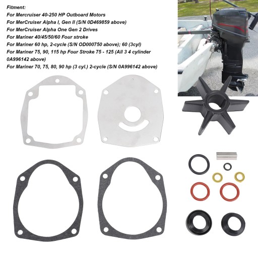 1. Dotyczy modeli: Zestaw uszczelek wirnika pompy wodnej to napędy MerCruiser Alpha One Gen 2, do silników zaburtowych Mercruiser 40–250 KM i dwusuwowych silników zaburtowych Mariner V200/225/250 KM (3,0 l).