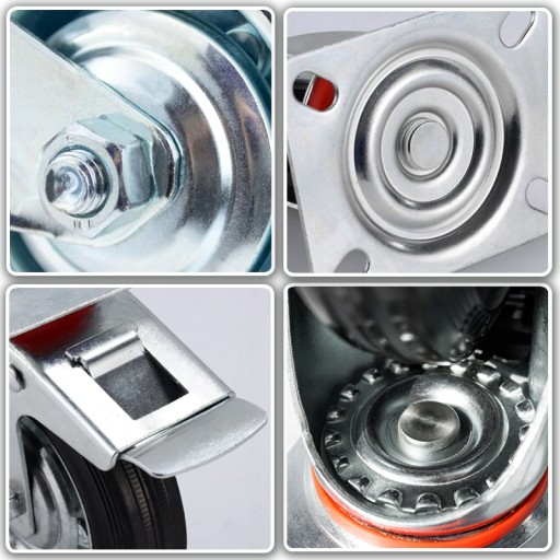 ⭐ Mocowanie: Tłoczona blacha stalowa ocynkowana, w głowicy skrętnej z podwójnym łożyskowaniem kulkowym.