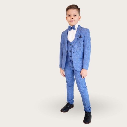 Marynarka klasycznego kroju, zapinana na jeden guzik. Posiada odpowiedni krój, dzięki czemu ubranie dopasowuje się do gabarytu dziecka, a Twoje dziecko odczuwa komfort i wygodę z użytkowania. Tkanina jest przyjemna w dotyku, a przede wszystkim łagodna dla skóry dziecka.