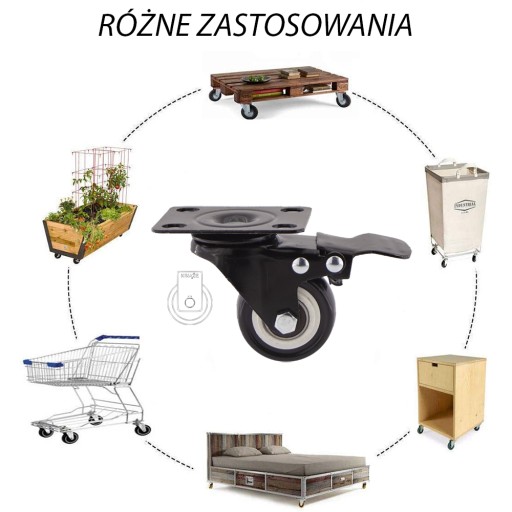 - KOŁO składa się z polipropylenowej piasty oraz z niebrudzącej poliuretanowej opony, posiada podwójne łożysko kulkowe. Kółka mają wytrzymałość po 50 kg na kółko. Wolno się zużywają, są odporne na uszkodzenie, amortyzują uderzenia i wibracje. Obracają się o 360 stopni ułatwiając manewrowanie meblami czy wózkiem. Gładko obracają się po twardych i gładkich powierzchniach jak beton przy bardzo małym tarciu.