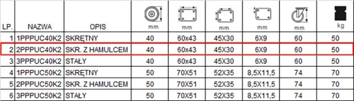 - Typ koła: PPPUC, łożysko kulkowe.