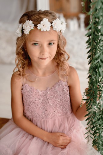 Luksusowa sukienka dla dziewczynki to model wykonany z koronki oraz tiulu w kolorze różowym. Kolor sukienki przypadnie do gustu każdej dziewczynce. Delikatny brudny róż z koronkowym akcentem bez wątpienia przyciągnie uwagę otoczenia. Z względu na swój wyjątkowy krój i materiał sukienka jest bardzo elegancka i dziewczęca. Subtelna koronka dodaje jej uroczego szyku, a co więcej miękkość materiału sprawia, że nie można oderwać od niej oczu. Ze względu na fakt, że sukieneczka jest bardzo przyjemna, zwiewna i wygodna twoje dziecko będzie miało zapewniony komfort noszenia. Zastosowaliśmy podwójną warstwę tiulu.