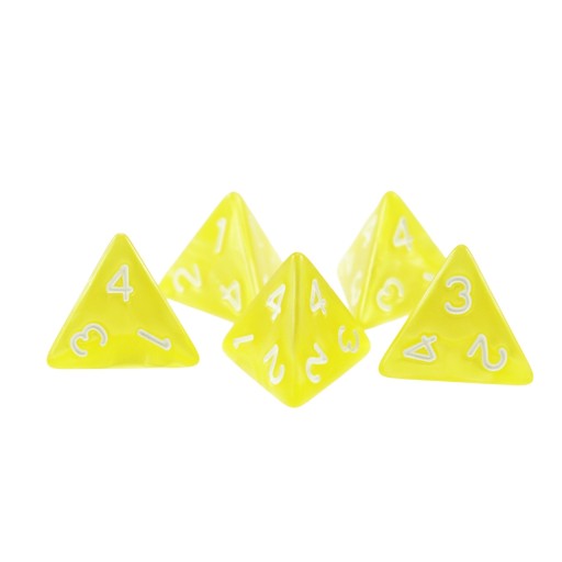 Komplet pięciu kości czterościennych. Niezwykle wysoka jakość odlewu, precyzja żłobienia oraz malowania numerów czynią z nich podstawowy wybór dla wielu graczy, zarówno początkujących, jak i zaawansowanych.