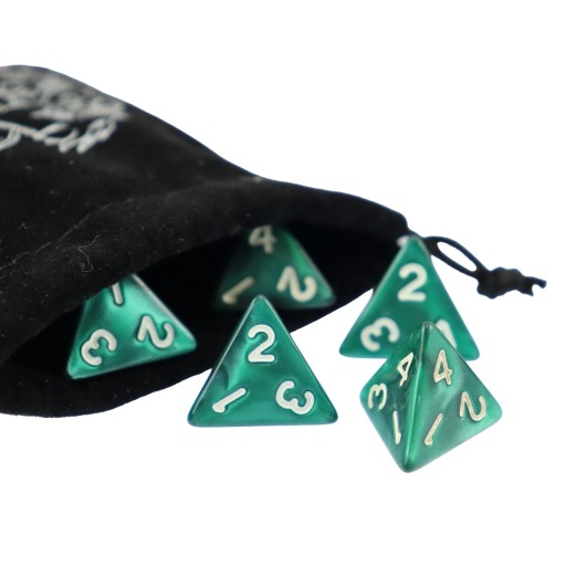 Komplet dwóch kości czterościennych. Niezwykle wysoka jakość odlewu, precyzja żłobienia oraz malowania numerów czynią z nich podstawowy wybór dla wielu graczy, zarówno początkujących, jak i zaawansowanych.