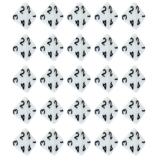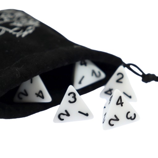Komplet dwudziestu pięciu kości czterościennych. Niezwykle wysoka jakość odlewu, precyzja żłobienia oraz malowania numerów czynią z nich podstawowy wybór dla wielu graczy, zarówno początkujących, jak i zaawansowanych.