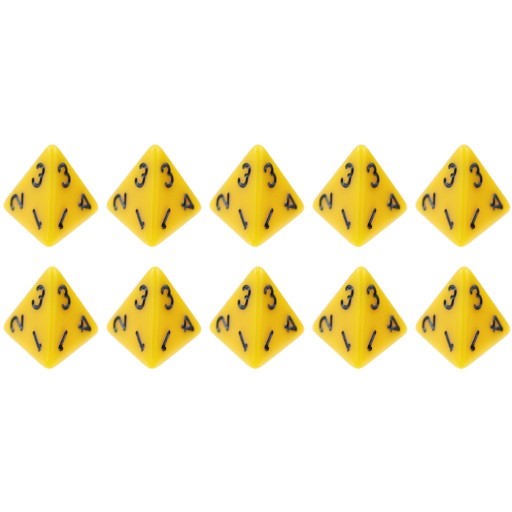 Komplet dziesięciu kości czterościennych. Niezwykle wysoka jakość odlewu, precyzja żłobienia oraz malowania numerów czynią z nich podstawowy wybór dla wielu graczy, zarówno początkujących, jak i zaawansowanych.