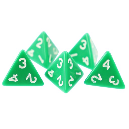 Komplet dwudziestu pięciu kości czterościennych. Niezwykle wysoka jakość odlewu, precyzja żłobienia oraz malowania numerów czynią z nich podstawowy wybór dla wielu graczy, zarówno początkujących, jak i zaawansowanych.
