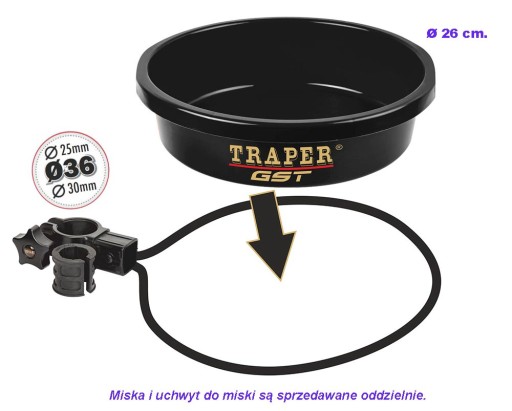 Miska czarna Traper 26cm. Miska plastikowa, idealna do przygtowywania zanęt i przynęt w tym przepuszczania białych robaków, pinek i ochotki. Miska pasuje i jest w pełni kompatybilna z uchwytem do miski Traper.