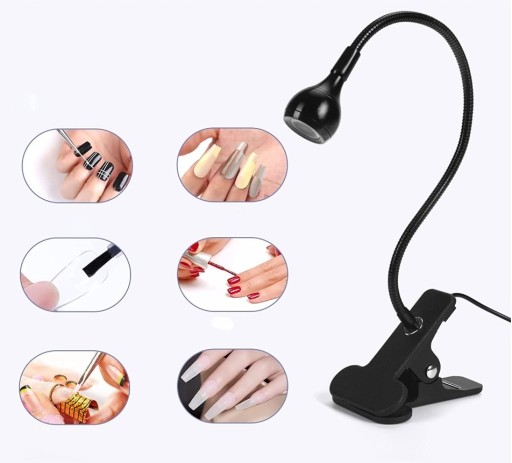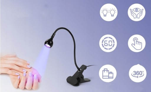 Lampkę przymocować do biurka dolnym klipsem i utwardzać sam początek stylizacji na górnych formach ( /- 10sekund). Po zdjęciu formy, zaciskamy kształt i kontynuujemy utwardzanie w klasycznej lampie.