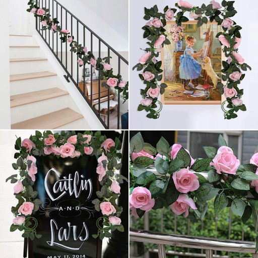 Girlandy z róż - Składa się z pięknych róż i naturalnie zielonych liści, bardzo dobrze imituje żywą roślinność. Główki kwiatowe w różnych rozmiarach ułożono tak, by tworzyły niezwykle naturalny efekt.