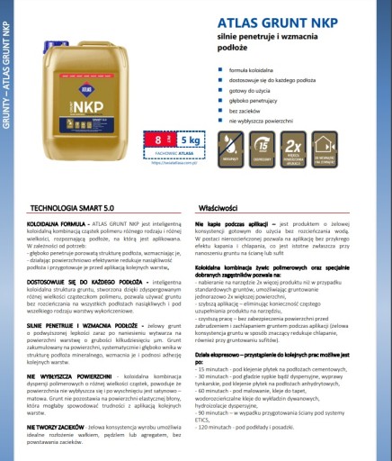 Grunt Atlas NKP 5 kg znajdzie zastosowanie wewnątrz i na zewnątrz budynków. To produkt, który jest gotowy do użycia. Nie wymaga mieszania i rozcieńczania. Prezentowany grunt może być nanoszony wałkiem, pędzlem lub metodą natryskową. Niezależnie od wybranej metody substancja nie powoduje chlapania i kapania. Grunt Atlas NKP 5 kg charakteryzuje się formułą koloidalną. Dostosuje się przy tym do każdego podłoża i nie powoduje wybłyszczania powierzchni. Produkt wyróżnia silna penetracja. Zapewnia także wzmocnienie malowanego podłoża. Grunt nie powoduje powstawania zacieków. Formuła koloidalna, dostosowuje się do każdego podłoża, silnie penetruje i wzmacnia podłoże, nie wybłyszcza powierzchni, nie powoduje zacieków, grunt gotowy do użycia - bez kapania i chlapania