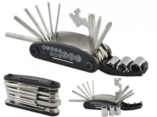 Klucze do roweru w poręcznej obudowie scyzoryka. Zestaw zawiera 16 najpotrzebniejszych kluczy do regulacji roweru. Zajmują mało miejsca łatwo można je schować w kieszeni.