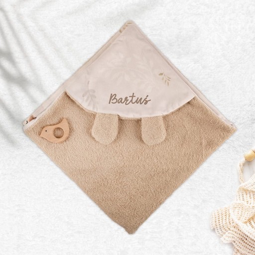 Zestaw zawiera dwie główne atrakcje: personalizowany ręczniczek-otulacz i towarzyszącego mu pluszowego zajączka. Eleganckie pudełko zawiera nadruk "Dla Ciebie" na wierzchu, w środku natomast zdobi go wklejka ze zwierzątkami i tekstem: