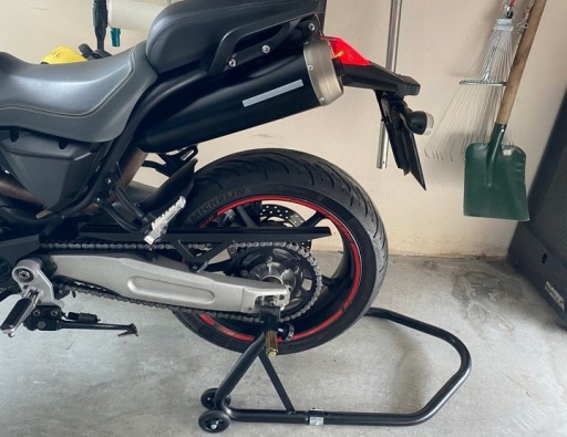 Sprawdza się również podczas przechowywania motocykla, ponieważ zajmuje wtedy mniej miejsca, opony nie są obciążone, zatem możesz zapomnieć o ryzyku odkształcenia opon.