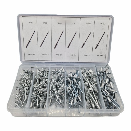 - Uniwersalny zestaw nitów zrywalnych używany przy nitowaniu. Całość umieszczona w poręcznym pudełeczku z przegrodami podzielonymi na rozmiary. Każda przegroda ma wypisane rozmiary jakie w sobie zawiera.