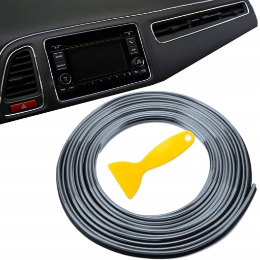 Listwa o długości 5 metrów została wykonana z elastycznego materiału. Taśmę można dociąć do pożądanego wymiaru za pomocą nożyczek lub noża. Pasuje do wszystkich szczelin wewnątrz samochodu, takich jak drzwi, wokół radia, skrzyni biegów oraz deski rozdzielczej. Na zgięciach należy przyciąć listwę na czarnym materiale.