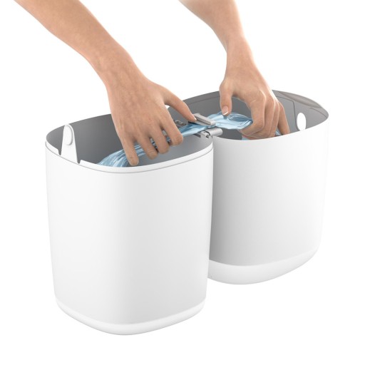 Konstrukcja pojemnika umożliwia wygodną jednoręczną obsługę i higieniczne opróżnianie. Zabezpieczony nożyk wewnątrz pojemnika ułatwia odcinanie worka.