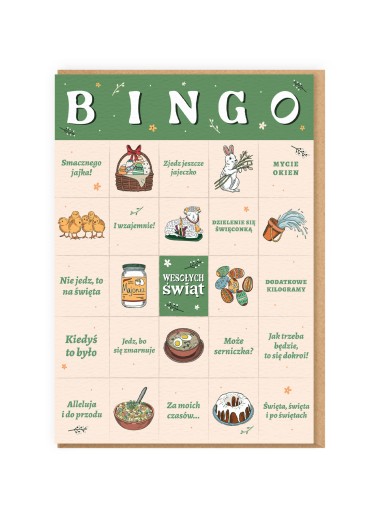 Kto z nas nie zna tych sezonowych klasyków? Czekamy na nie jak na zbawienie i szykujemy barwne niczym pisanki riposty. My trzymamy się tradycji i chcemy dumnie pielęgnować dawne obyczaje. Kartka wielkanocna BINGO to świetny prezent dla osoby z humorem i… jajem! Daj komuś radość i podaruj oryginalną świąteczną kartkę wielkanocną.