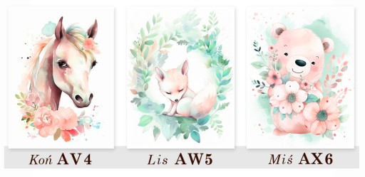 OBRAZEK PLAKAT DZIECIĘCY PASTELOWE ZWIERZĘTA LEŚNE MIŚ SARNA KOŃ - WZORY A4