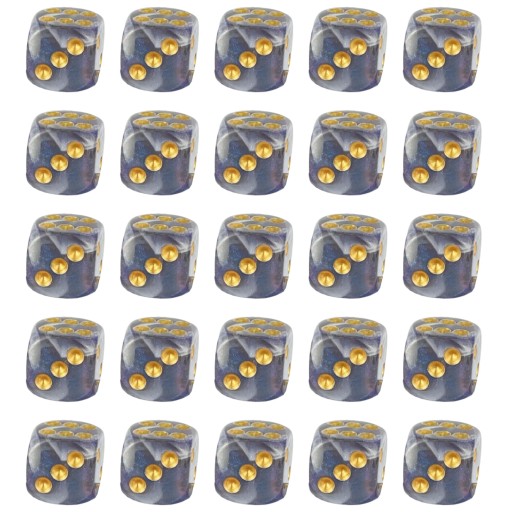 Komplet dwudziestu pięciu kości sześciościennych. Niezwykle wysoka jakość odlewu, precyzja żłobienia oraz malowania numerów czynią z nich podstawowy wybór dla wielu graczy, zarówno początkujących, jak i zaawansowanych.