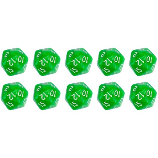 Komplet dziesięciu kości dwudziestościennych. Niezwykle wysoka jakość odlewu, precyzja żłobienia oraz malowania numerów czynią z nich podstawowy wybór dla wielu graczy, zarówno początkujących, jak i zaawansowanych.