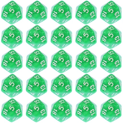Komplet dwudziestu pięciu kości dwudziestościennych. Niezwykle wysoka jakość odlewu, precyzja żłobienia oraz malowania numerów czynią z nich podstawowy wybór dla wielu graczy, zarówno początkujących, jak i zaawansowanych.