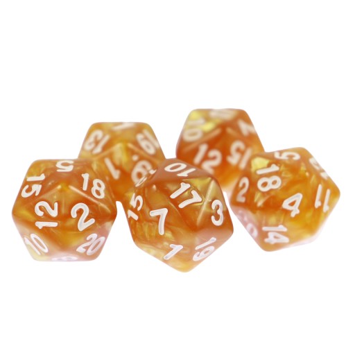 Komplet pięciu kości dwudziestościennych. Niezwykle wysoka jakość odlewu, precyzja żłobienia oraz malowania numerów czynią z nich podstawowy wybór dla wielu graczy, zarówno początkujących, jak i zaawansowanych.