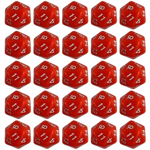 Komplet dwudziestu pięciu kości dwudziestościennych. Niezwykle wysoka jakość odlewu, precyzja żłobienia oraz malowania numerów czynią z nich podstawowy wybór dla wielu graczy, zarówno początkujących, jak i zaawansowanych.