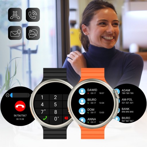 1. Odbieranie połączeń i rozmowy z poziomu zegarka – unieś nadgarstek, aby sprawdzić kto dzwoni. Rozmawiaj bez brania telefonu do ręki. Smartwatch pełni funkcję zestawu głośnomówiącego, gdy nie możesz korzystać z telefonu.