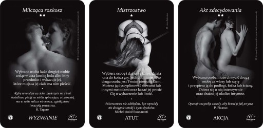 - Karty zadań zdobią zmysłowe ilustracje aktów, a dzięki ich subtelnemu charakterowi, gra pozwala przełamać nieśmiałość, buduje seksualne napięcie i korzystnie wpływa na rozwój relacji.