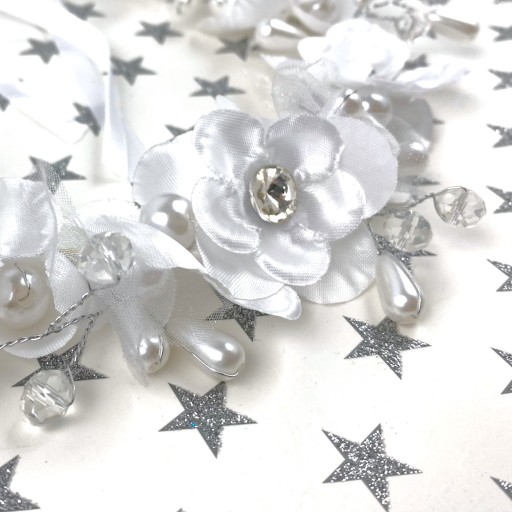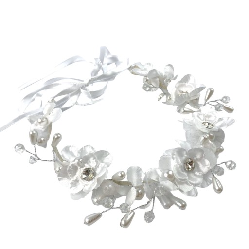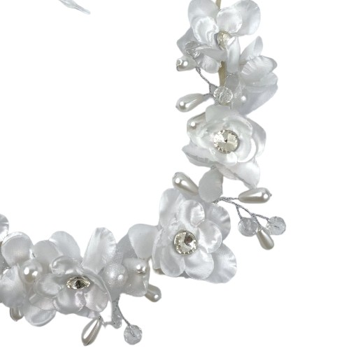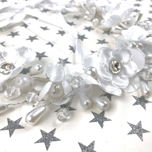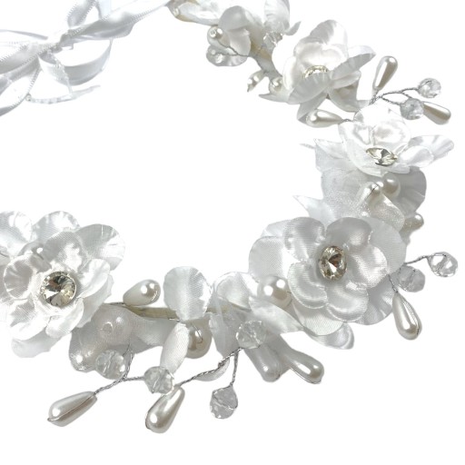 Klasyczny wianek wytwornie zdobiony. Do jego wykonania zostały użyte najwyższej jakości dodatki. Piękne białe stynowe kwiatuszki, białe listki oraz koraliki i perełki pięknie odstające na dekoracyjnych delikatnych drucikach. Całość przepięknie sie prezentuje. Dodatkowo we wianek zostały wplecione satynowe tasiemki do związania wianka na dogodnej szerokości.