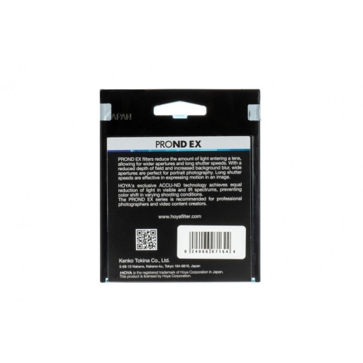 Filtr neutralny szary HOYA ND0.9 (8x) z serii PROND EX, stworzonej z myślą zarówno o fotografach, jak i filmowcach. Obniża ekspozycję o 3 stopnie, umożliwiając szersze otwarcie przysłony lub wydłużenie czasu naświetlania.