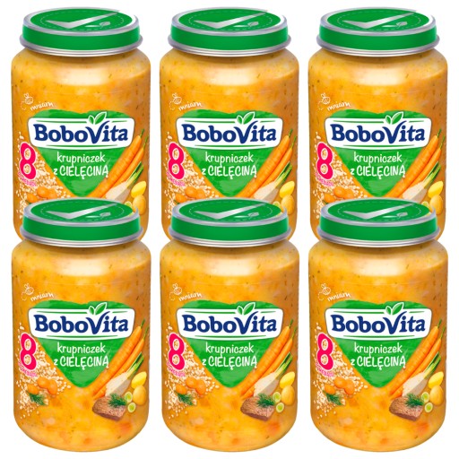 Składniki: Woda użyta do przygotowania, warzywa 36,2% (marchewka 13%, ziemniaki 12%, seler 3,4%, por 3,4%, pietruszka, cebula), mięso cielęce 8%, kaszka jęczmienna 3%, mąka pszenna, olej rzepakowy, natka pietruszki, koper 0,11%.