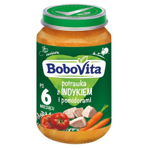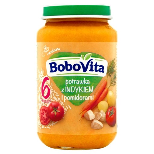 Składniki: Warzywa 69,6% (marchew 26%, przecier pomidorowy 18,7%, ziemniaki 18%, por, seler, pietruszka), kleik ryżowy 9,9%, mięso z indyka 9,5%, woda użyta do przygotowania, olej rzepakowy