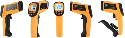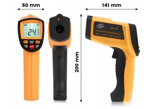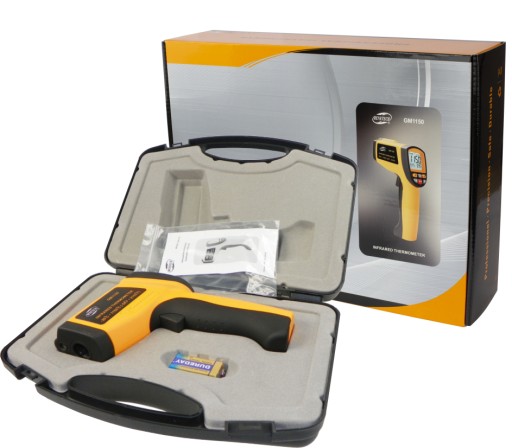 Wysokiej jakości termometr bezkontaktowy marki Benetech o zakresie temperatur od -30 do +1150 °C. Urządzenie wyposażone jest w celownik laserowy, który umożliwia precyzyjne nacelowanie badanego punktu. W urządzeniu zastosowano dobrej jakości materiały, a ergonomiczna budowa poprawia wygodę użytkowania termometru. Podświetlany wyświetlacz umożliwia pracę z urządzeniem w ciemności. Pirometr wyposażony jest w funkcję automatycznego wyłączenia zwiększając oszczędność w zużyciu baterii.
